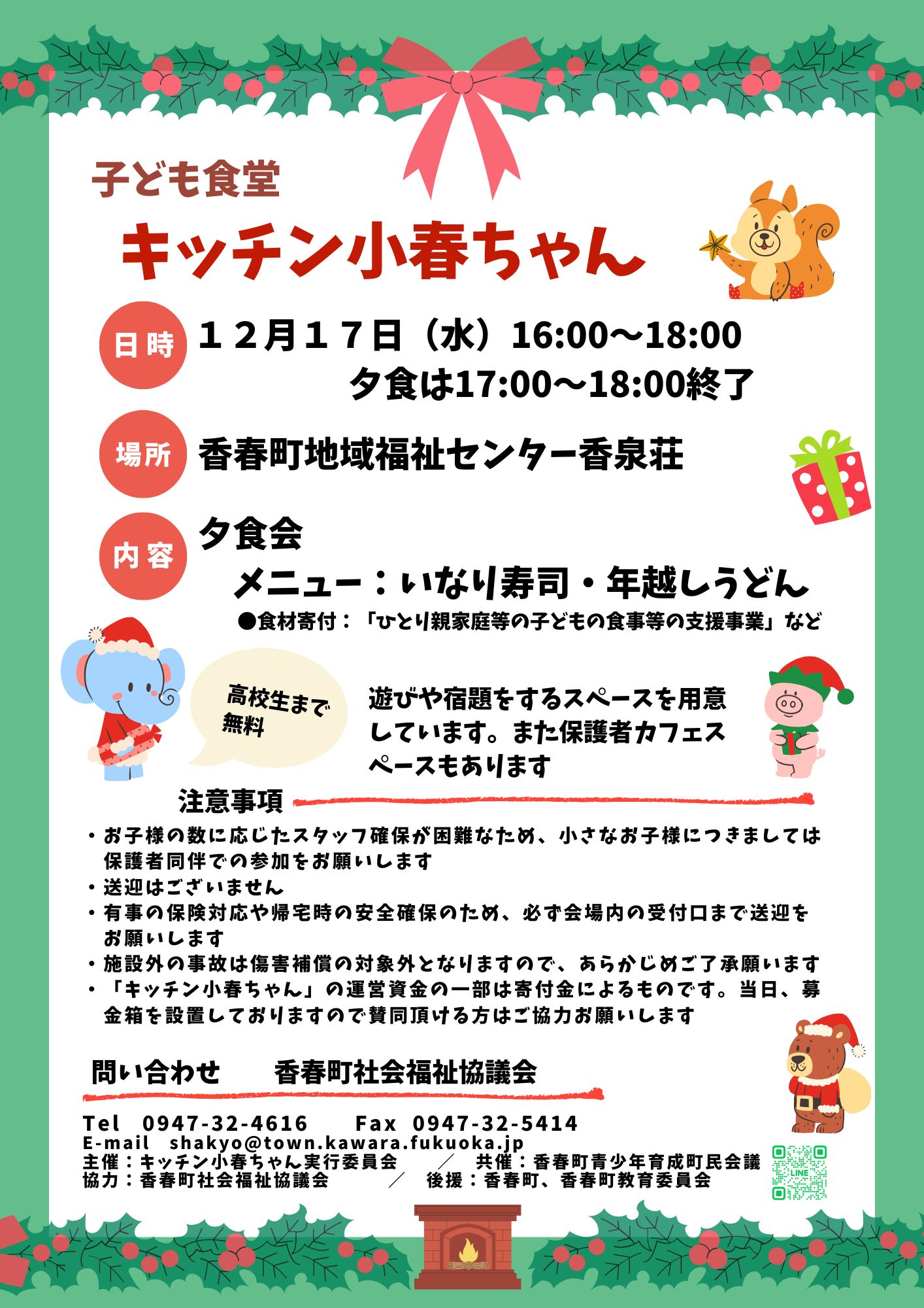 今月の子ども食堂は会食形式で開催します■日 時 令和7年12月17日(水) 16時~18時(食事は17時~18時終了)■場 所 香春町地域福祉センター香泉荘 香春町大字高野727番地■メニュー いなり寿司、年越しうどん