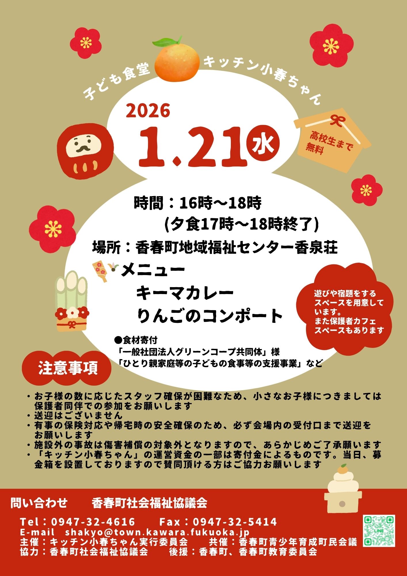 子ども食堂 ♪1月の子ども食堂のご案内です♪〇日 時 令和8年1月21日(水)16時~18時 (夕食は17時~18時終了)〇場 所 香春町地域福祉センター香泉荘〇内 容 夕食会(キーマカレー・りんこのコンポート)