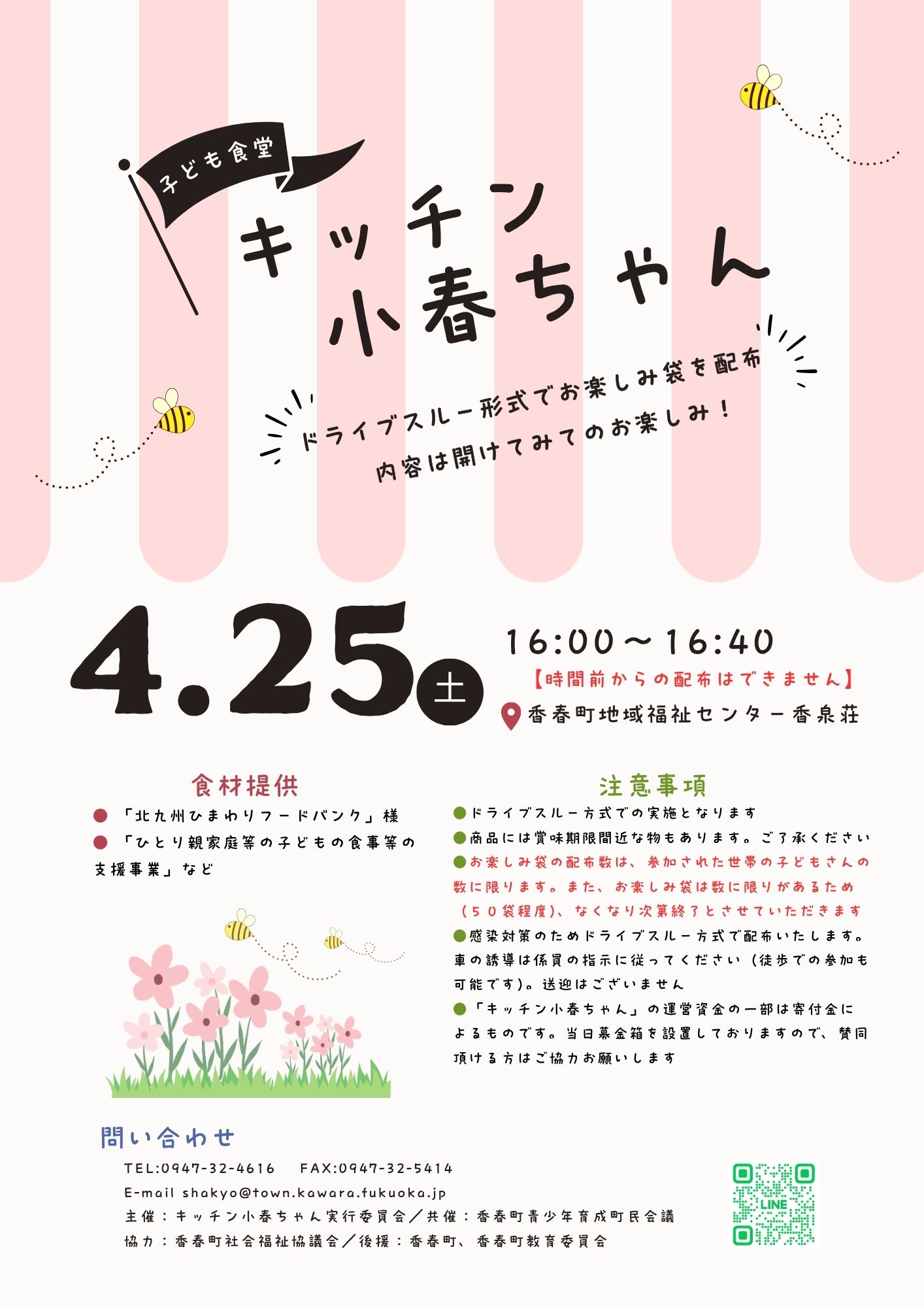 子ども食堂 ♪4月の子ども食堂のご案内♪〇日 時 4月25日(土)16:00~16:40 ※開始時間前からの配布はできません〇場 所 香春町地域福祉センター香泉荘〇内 容 ドライブスルー形式でお楽しみ袋を配布